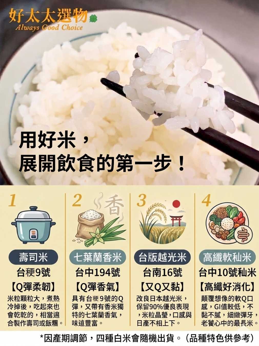 4 種白米品種:各自綻放的風味,值得您細細品味…(因產期調節,四種白米會隨機出貨。)